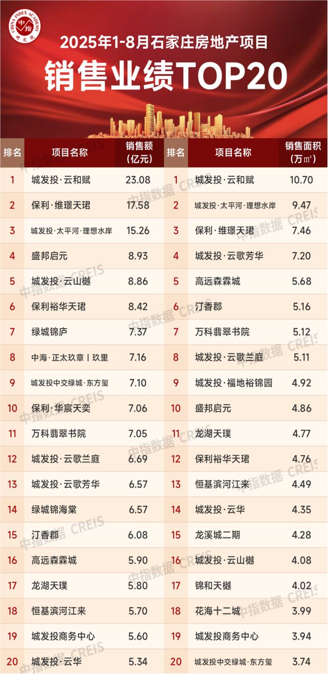 2025年1-8月石家庄商品房销售金额TOP20项目共成交172.11亿元,入榜门槛为5.34亿元。其中城发投·云和赋项目以销售业绩23.08亿元位居榜首,保利·维璟天珺项目以17.58亿元的销售业绩位居第二,城发投·太平河·理想水岸项目以15.26亿元的销售业绩位列第三。