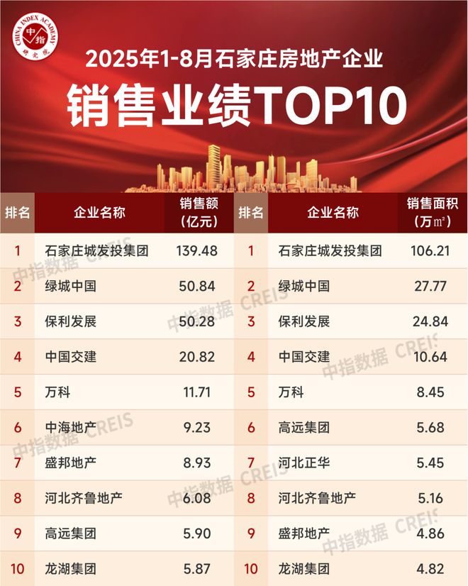 2025年1-8月石家庄房地产企业销售金额TOP10共成交309.15亿元,TOP10门槛值为5.87亿元。其中石家庄城发投集团以139.48亿元的销售业绩荣膺销售榜首位,绿城中国以50.84亿元位居榜单第二,保利发展以50.28亿元位列第三。