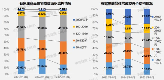 成交户型与价格:2025年1-8月120-160㎡的商品住宅成交量占整体成交量的比例最高,占比为41.17%。2025年1-8月总房款100-150万元的商品住宅成交量占整体成交量的比例最高,占比为24.93%。